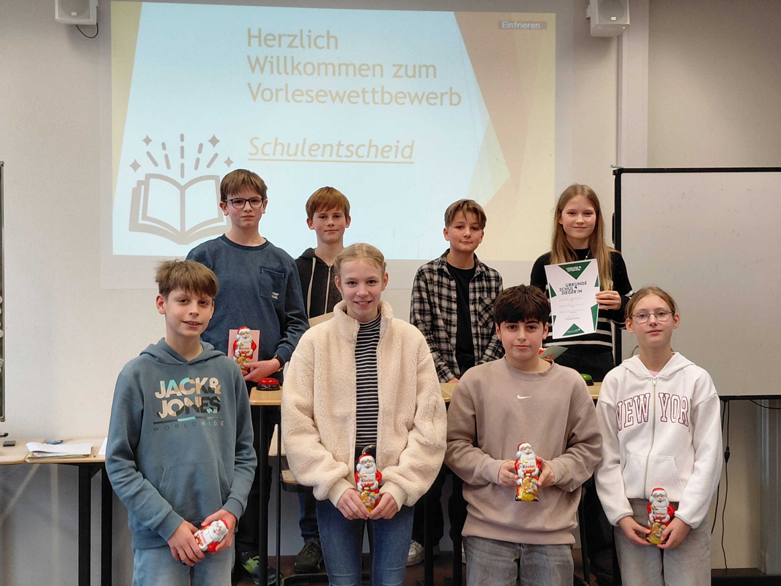 Nachdem jedes Kind der Klasse 6 in den vergangenen Wochen ein Buch im Klassenverband präsentiert und eine Textpassage daraus vorgelesen hatte, traten nun die zwei besten Vorleser jeder Klasse beim Schulentscheid gegeneinander an.