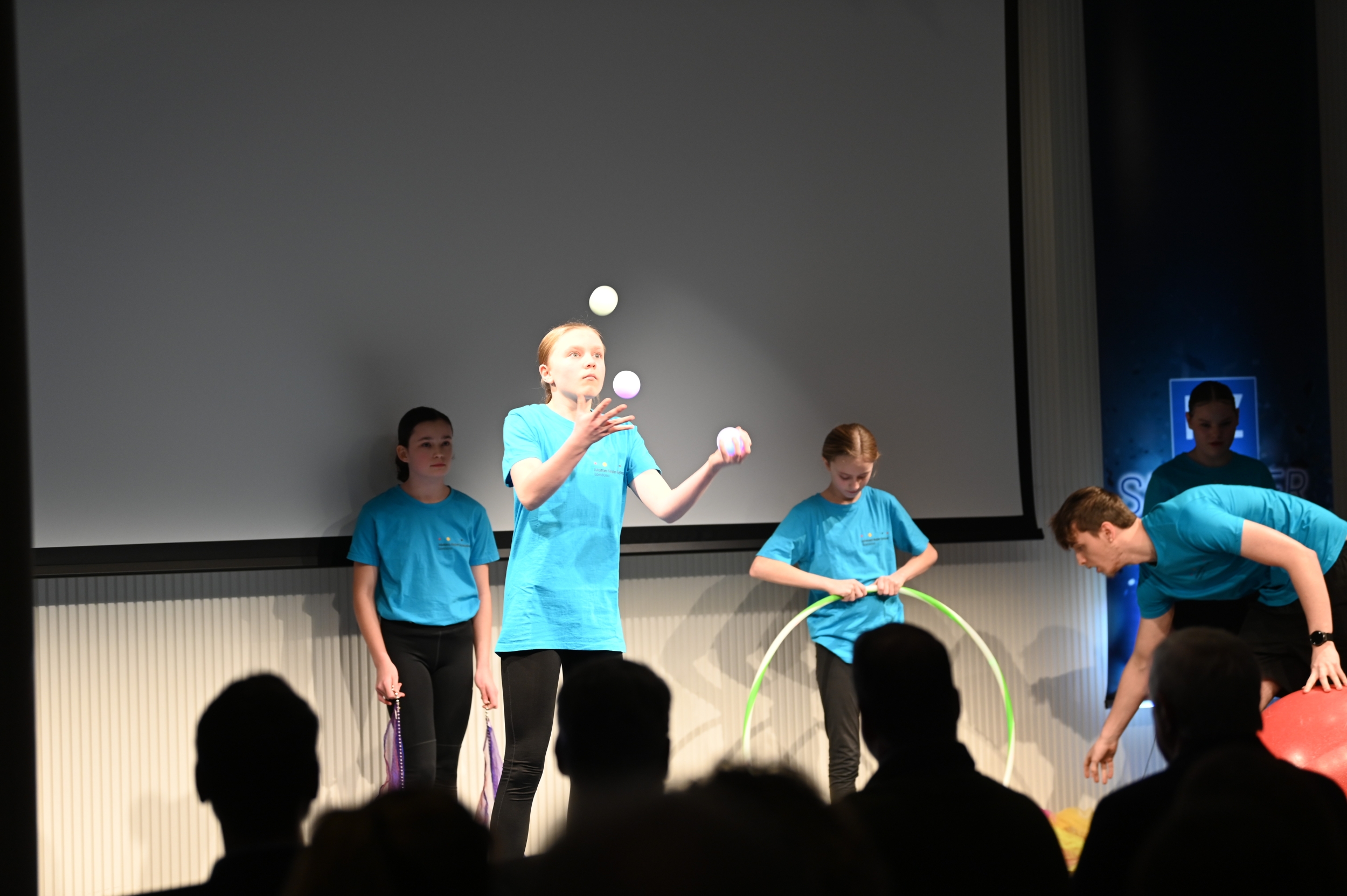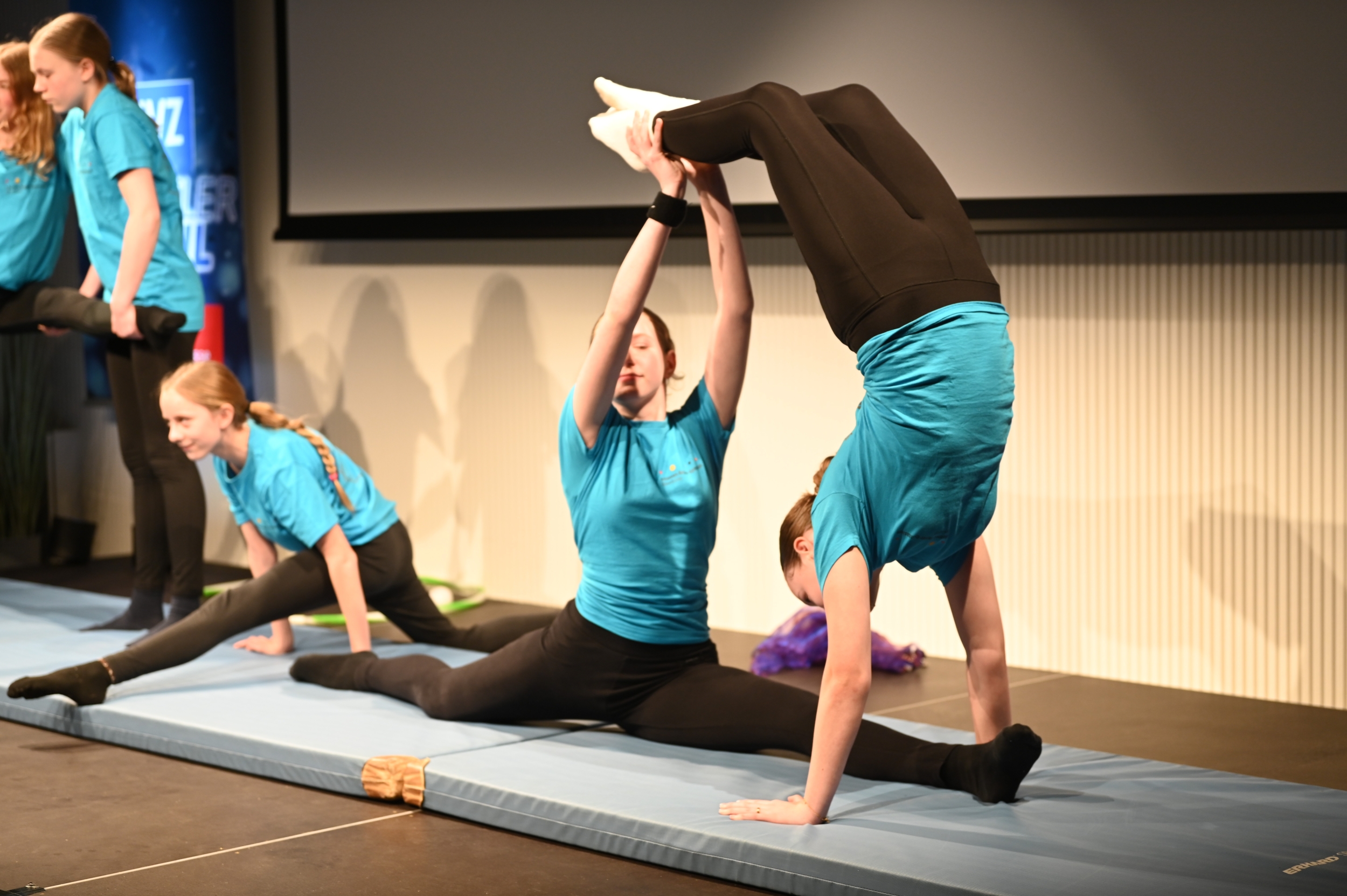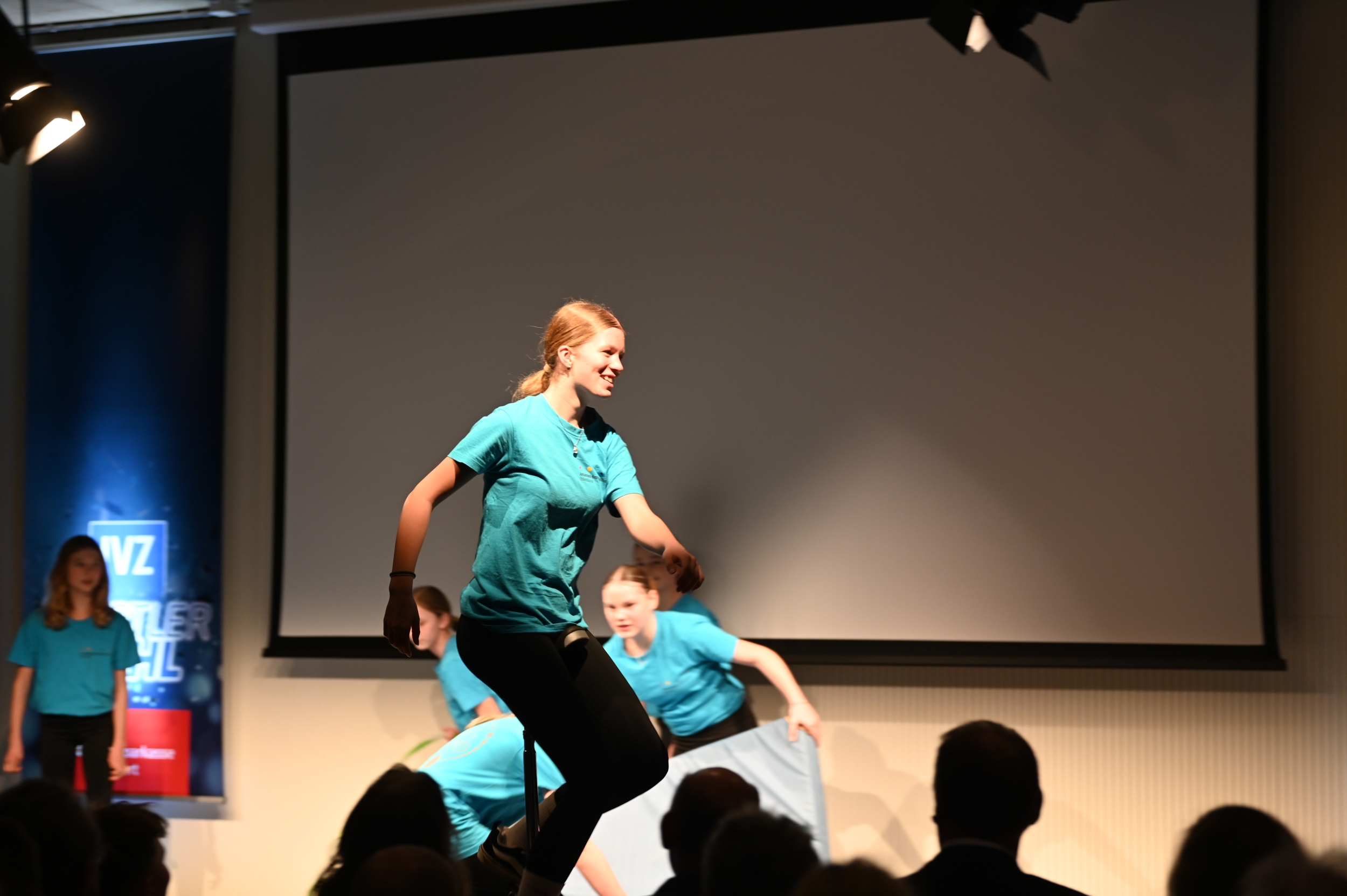Das Besondere: Der erste Auftritt fand bei der Ehrung der "Sportlerwahl des Jahres 2025" durch die IVZ und die Kreissparkasse Steinfurt statt. Neun Teilnehmende der Jonglage-AG fanden sich am Donnerstagabend im Saal der IVZ im Südstadtquartier ein und wurden als erster "Showact" nach der Ehrung der Newcomer des Jahres angekündigt. Mit tollen Turnübungen und Präsentationen auf dem Hochrad und dem Laufball begeisterte die Gruppe das Publikum.