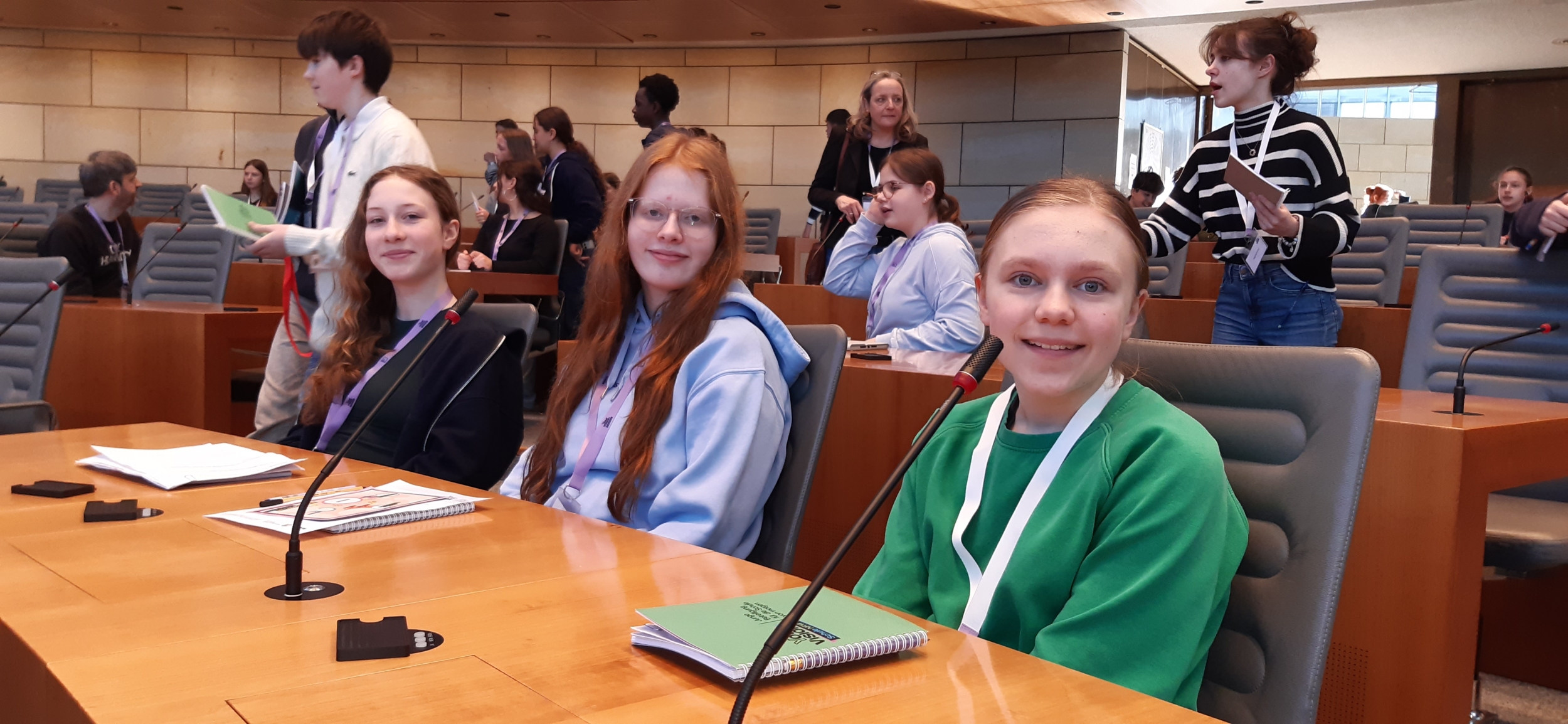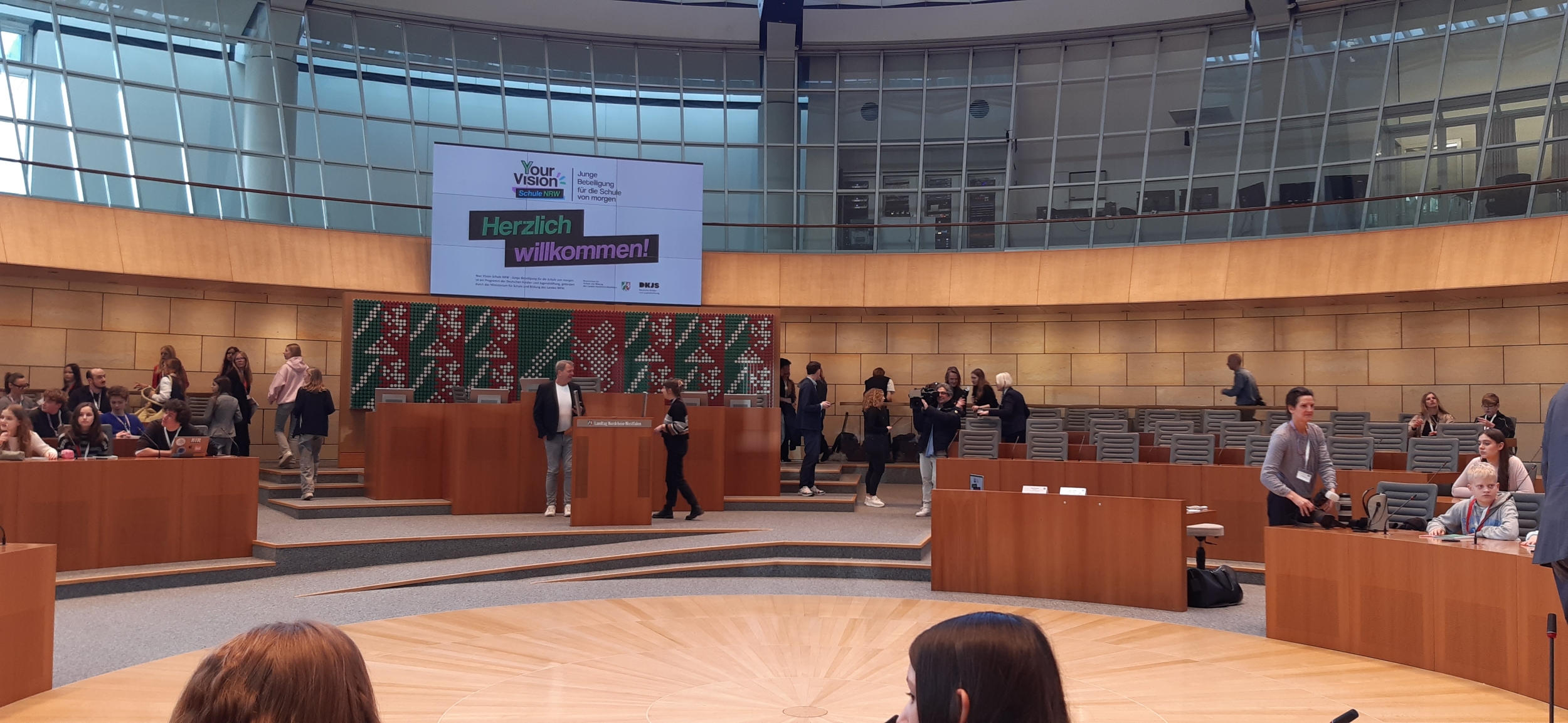 Uns wurde mitgeteilt, dass wir mit fünf Personen anreisen dürften. Eine Lehrkraft zähle aber nicht dazu. Allerdings mussten wir ein Thema abgeben, worauf wir uns in der nächsten Zeit spezialisierten. Wir wählten das Thema: Sitzmöglichkeiten auf dem Schulgelände. Somit beschäftigten wir uns in der nächsten Zeit mit diesem Schwerpunkt. Nach langem Warten war es dann am 9. Februar endlich so weit: Wir durften in den Landtag. Mit dabei waren: Enna (7d), Julika (8b), Emma (8b), Nathanael (8a) und Herr Leushacke. Wir fuhren mit dem Zug und nach zweieinhalb Stunden waren wir dann endlich beim Landtag. Dort wurden wir von der Leiterin von Your Vision (Sarah Vazquez), Rico Montero und Dorothee Feller begrüßt. Ein paar Leute wurden über den Tag verteilt auch vom Fernsehen, Reportern o. ä interviewt.